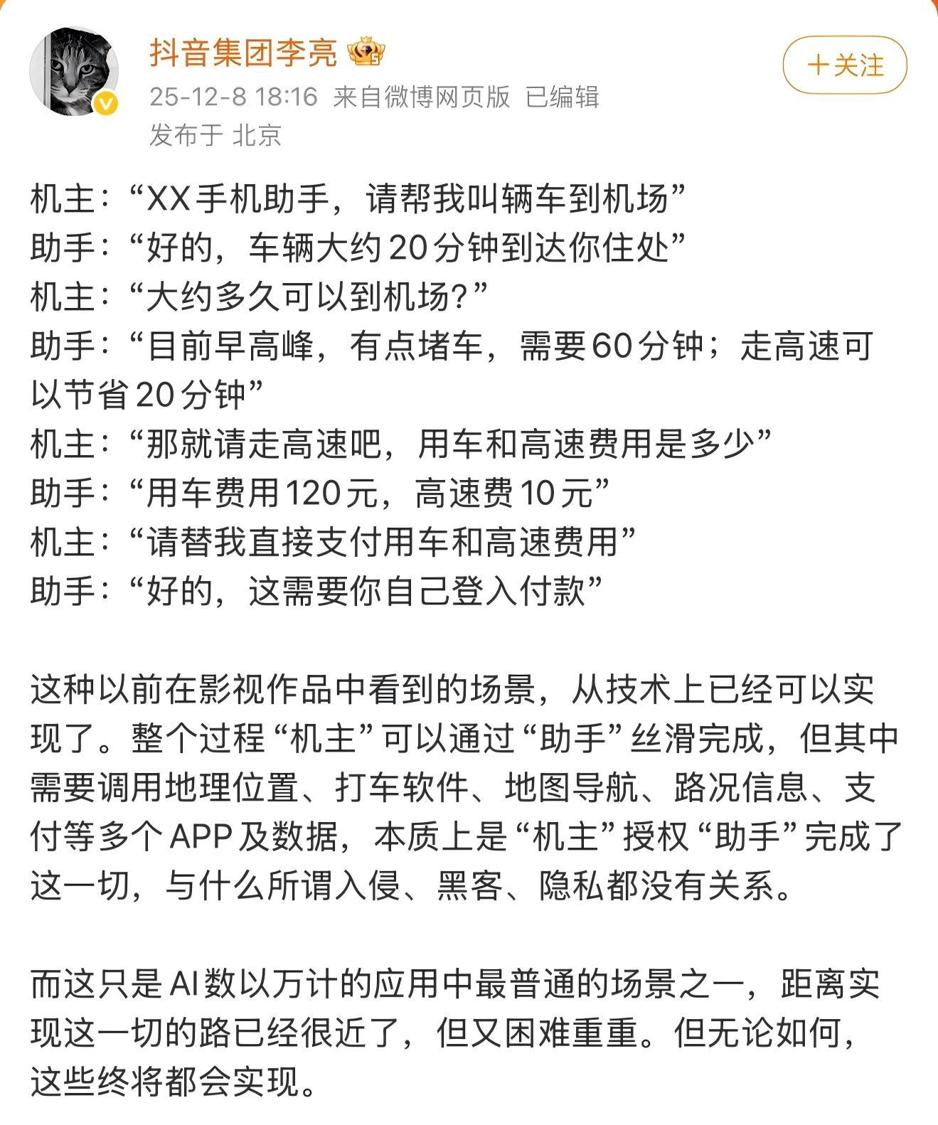 12月9日,字节跳动旗下抖音副总裁李亮发微博谈及豆包与中兴合作推出的AI手机助手,李亮认为,AI带来的变革是真实存在的,用户需求也是真实存在的,豆包和中兴的探索是一个开始。此前一天,李亮以打车场景举例飞乐乐,介绍了当前手机在实现复杂需求时的自动化操作。他强调,该功能的本质是机主授权助手完成操作,属于合法合规的数据使用范畴。