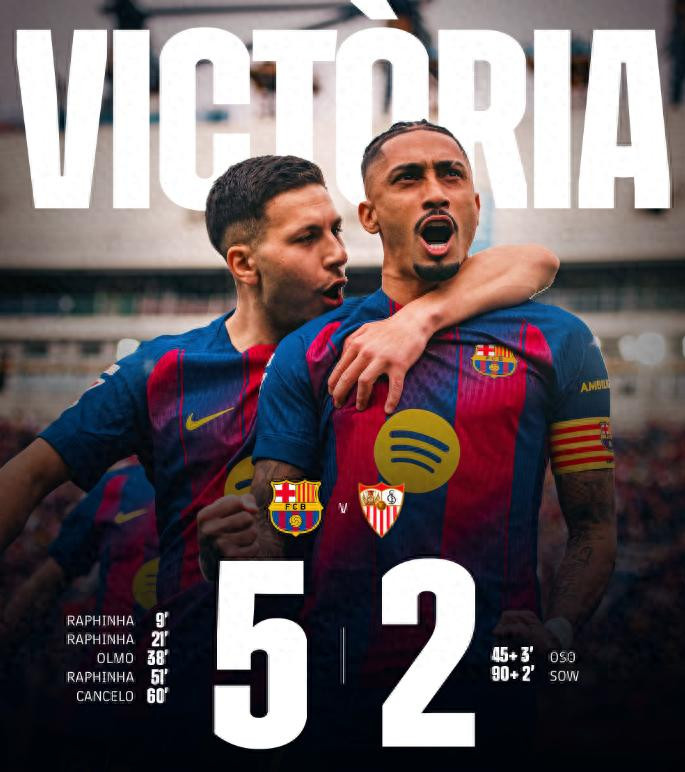 在刚刚结束的西甲第28轮比赛中,巴萨以5-2的比分大胜塞维利亚,成功复仇对手,在本赛季刚开始的时候,巴萨曾以1-4的比分惨败。