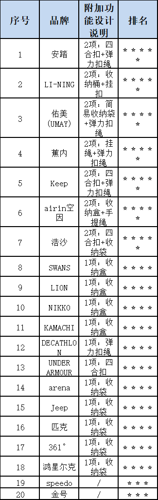 附加功能设计方面,安踏、LI-NING等7款样品因同时配备两种便携设计,如四合扣与弹力扣绳组合、收纳桶搭配挂扣等,大幅提升运动中的取用效率;而speedo和金号未配置任何收纳配件,便携性和附加功能表现薄弱。