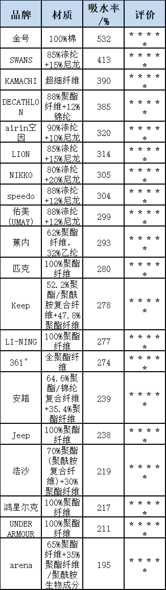 本次比较试验结果显示,20款样品的吸水率均高于150%,均达到Ⅲ级吸水率要求。具体来看,该项目表现最好的前三款样品分别是金号、SWANS、KAMACHI,吸水速率分别为532%、413%、390%;而排名靠后的三款样品分别为鸿星尔克、UNDER ARMOUR、arena的样品,吸水速率分别为217%、211%、195%领航配资,这三款样品的吸水速率相对于其他品牌样品而言相差较大。
