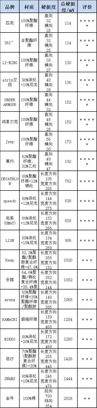 测试数据显示,不同品牌样品的柔软性存在显著梯度差异。其中匹克、361°等8款样品的总硬挺度均低于200 mN;而金号样品总硬挺度高达2528 mN,测试数据远超其他样品,其数值达到柔软性最佳样品的12倍以上,表现较差。