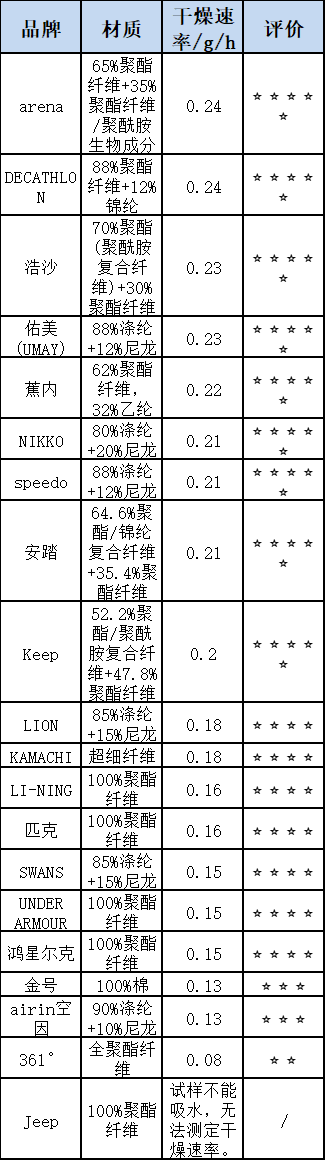 测试结果显示,arena、DECATHLON等两款品牌样品的干燥速率表现较好,均达到了0.24g/h。而表现较差的三款品牌样品则分别为361°、金号、airin空因,其中361°样品的干燥速率仅达到0.08g/h,金号、airin空因样品均为0.13g/h。此外,还有一款Jeep样品因其表面材质原因,导致其未能按测试方法测定干燥速率。