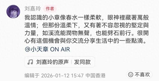 1月12日配亿多,知名艺人刘嘉玲晒出在家中接受章泽天采访的视频片段,配文称:“很开心有这个机会与你(章泽天)交流分享生活中的一些点滴。”